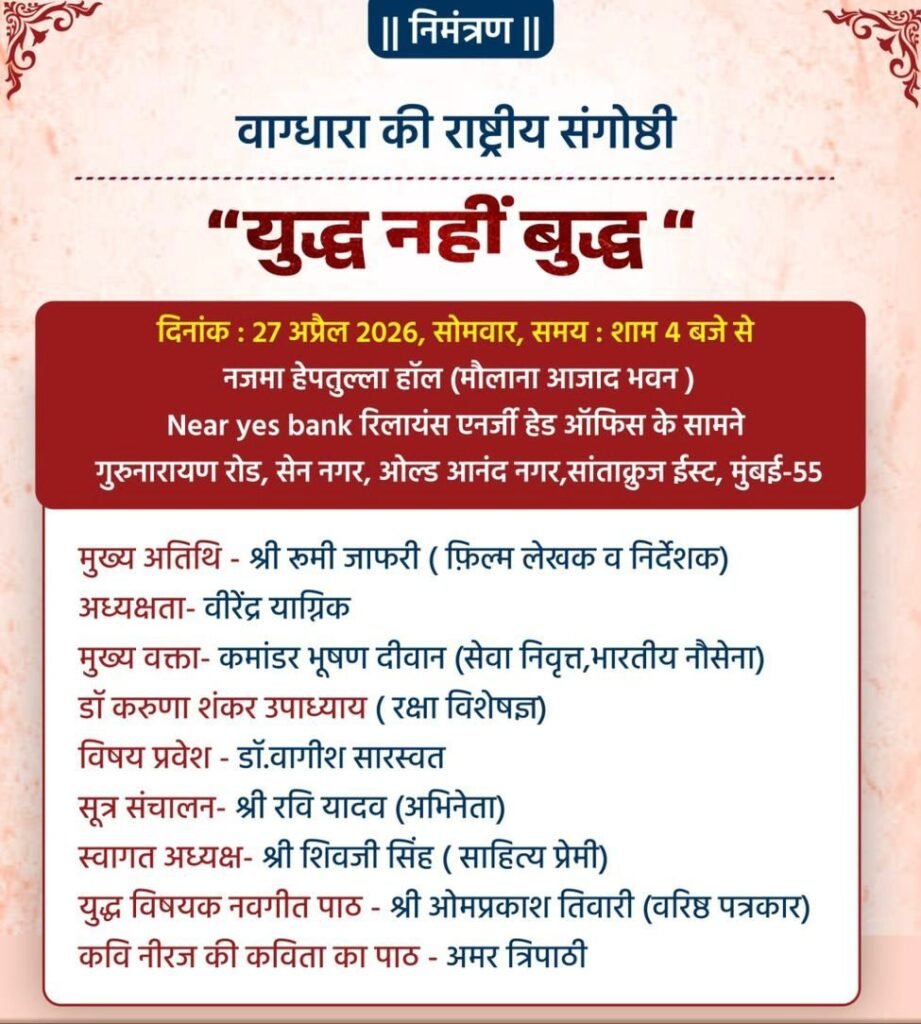 मुंबई । पूरी दुनिया पर छाये विश्वयुद्ध के संकट के विरोध में शांति का संदेश देने के मकसद से वाग्धारा संस्था ने आगामी 27 अप्रैल को सांताक्रुज पूर्व के मौलाना आजाद भवन में “युद्ध नहीं बुद्ध “एक दिवसीय राष्ट्रीय संगोष्ठी का आयोजन किया है । प्रख्यात लेखक व फ़िल्म निर्देशक रूमी जाफरी इस परिचर्चा के मुख्य अतिथि होंगे।