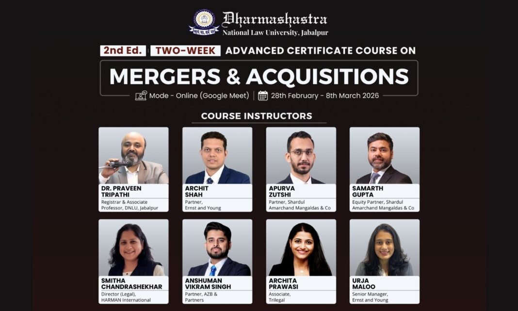 Dharmashastra National Law University (DNLU) Jabapur is organizing an Online Certificate Course on Mergers & Acquisitions commencing from 28th February.