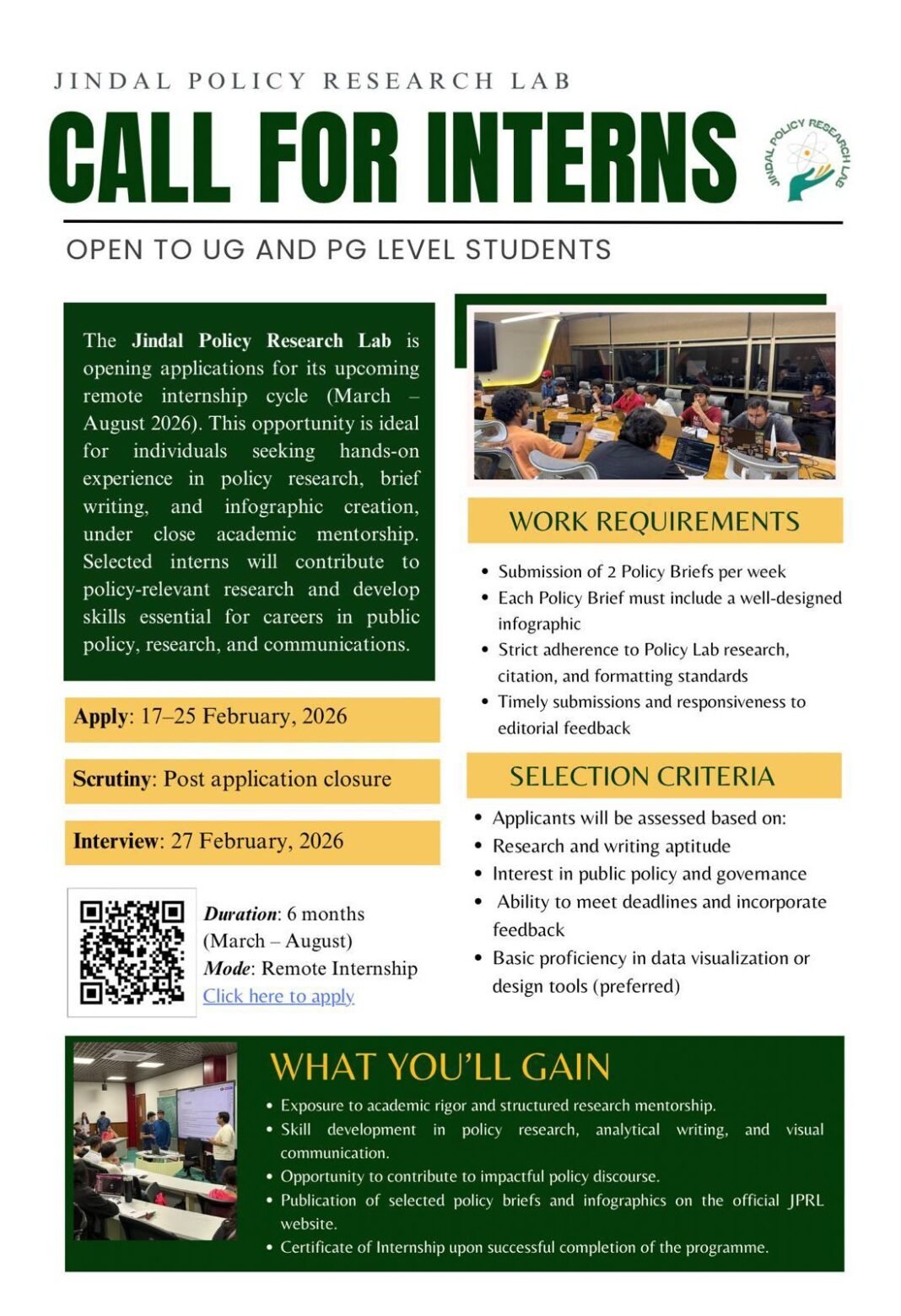The Jindal Policy Research Lab (JPRL) is inviting applications for its upcoming 6-month remote internship cycle.