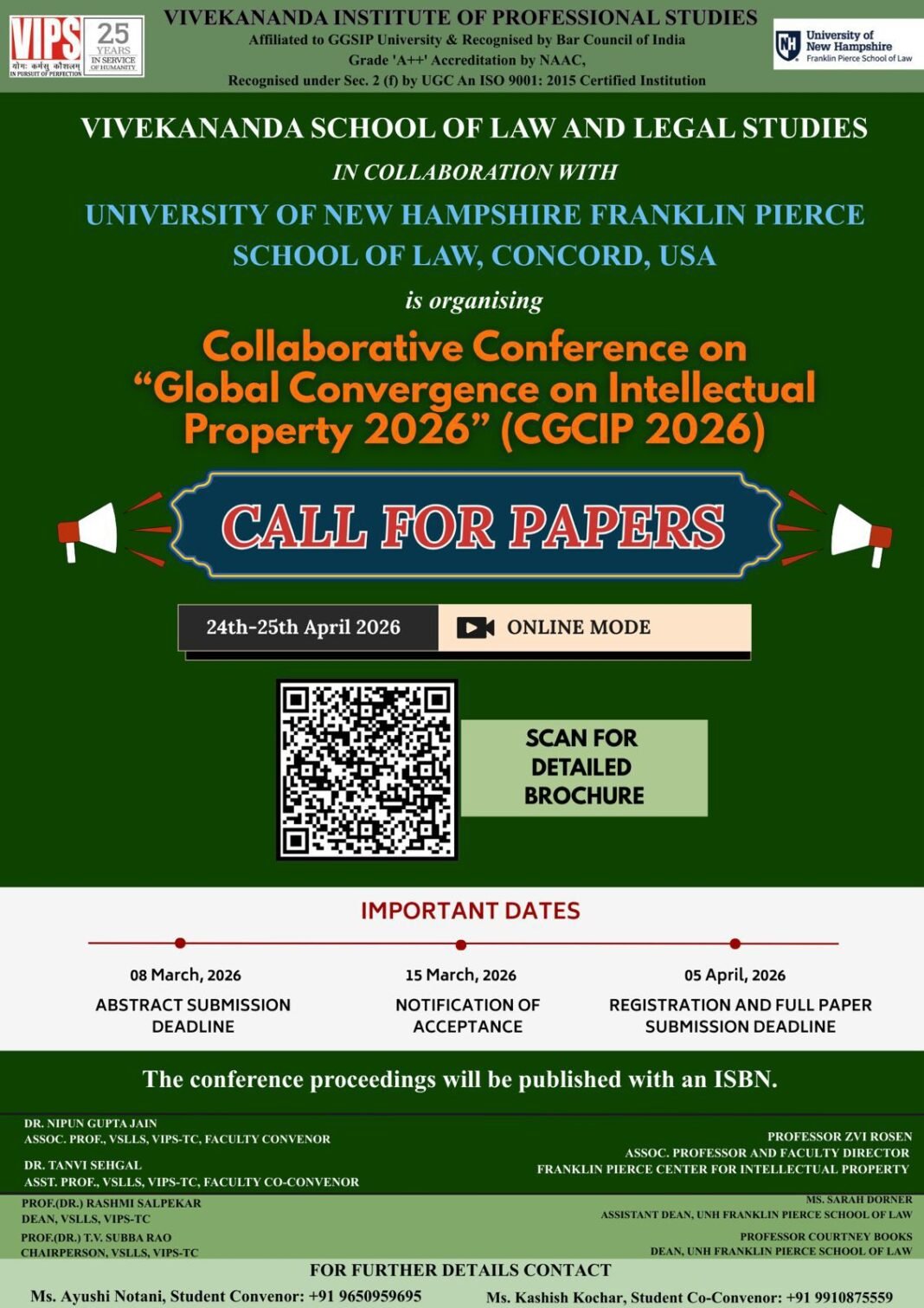 Vivekananda School of Law and Legal Studies (VSLLS), VIPS-TC, through its Centre for Intellectual Property Rights, is organizing a Collaborative Conference on “Global Convergence on Intellectual Property 2026” in collaboration with University of New Hampshire Franklin Pierce School of Law, Concord, USA on 24th and 25th April 2026, on the occasion of World IP Day 2026.