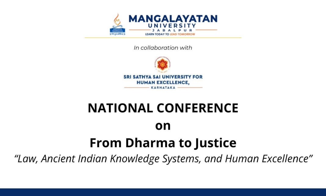 Faculty of Law, Mangalayatan University, Jabalpur is organizing a National Conference (Hybrid Mode) organized in collaboration with Sri Sathya Sai University for Human Excellence, Karnataka on “From Dharma to Justice: Law, Ancient Indian Knowledge Systems and Human Excellence.