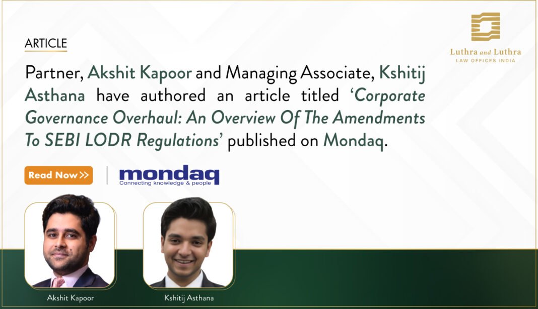 Partner Akshit Kapoor and Managing Associate Kshitij Asthana have authored an article titled ‘Corporate Governance Overhaul: An Overview of the Amendments to SEBI LODR Regulations’, published on Mondaq.