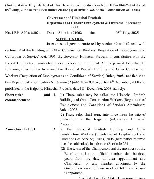 The Himachal Pradesh BOCW Amendment Rules, 2025 bring in: