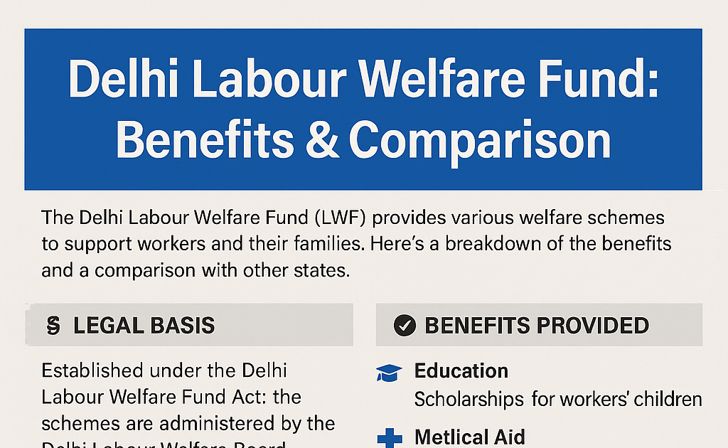 The Labour Welfare Fund (LWF) is a statutory benefit designed to improve the working and living conditions of workers across India. In Delhi, the Labour Welfare Fund is administered by the Delhi Labour Welfare Board (DLWB) under the Delhi Labour Welfare Fund Act, 1996. It provides multiple benefits such as education scholarships, medical aid, and vocational training for registered workers and their families. This article provides a detailed breakdown of eligibility, application process, legal provisions, and a comparison with similar schemes in other Indian states.