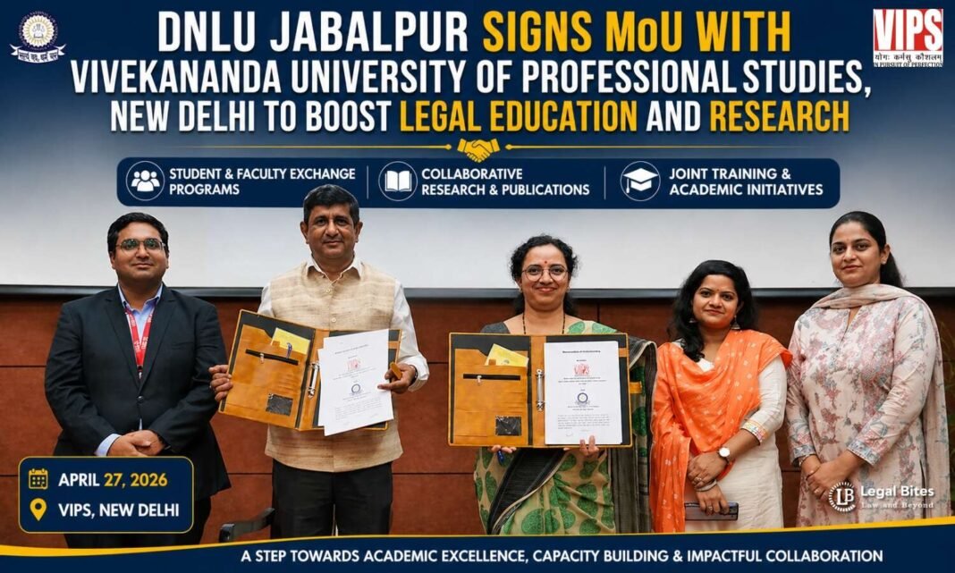 In a significant step towards strengthening academic collaboration and promoting excellence in legal education, Dharmashastra National Law University (DNLU), Jabalpur has entered into a Memorandum of Understanding (MoU) with Vivekananda University of Professional Studies, New Delhi. This strategic partnership reflects a shared commitment to fostering innovation, research, and holistic learning in the field of law.