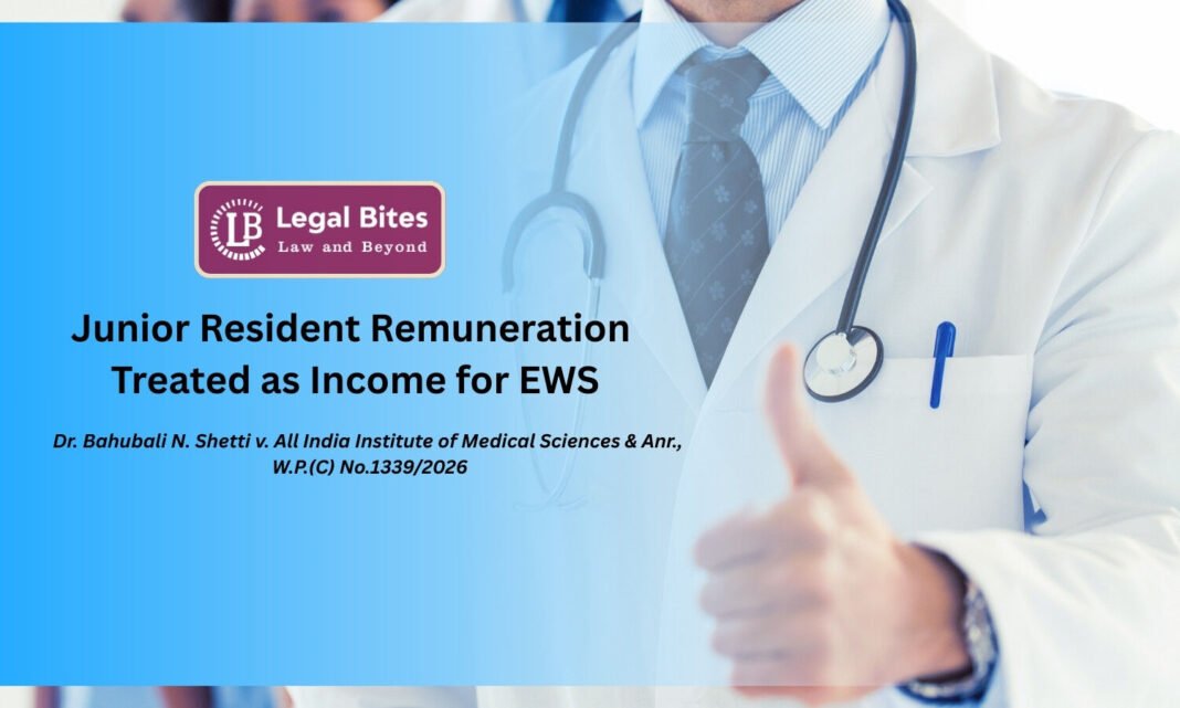 The Delhi High Court in Dr. Bahubali N. Shetti v. All India Institute of Medical Sciences & Anr., W.P.(C) No.1339/2026 delivered an important ruling on the meaning of income under the Economically Weaker Sections reservation policy. The Court held that the remuneration received by a Junior Resident doctor at AIIMS, even though described as a stipend, is income like a salary and must be considered while determining eligibility under the EWS category. The judgment clarifies that economic assessment for a reservation cannot depend upon the label attached to a payment and must instead examine the real character of the receipt.