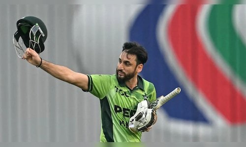 Short of his crease at the non-striker’s end, Agha was bending down to pick up the ball to return it to a Bangladesh bowler after his teammate Mohammad Rizwan had driven it towards him.