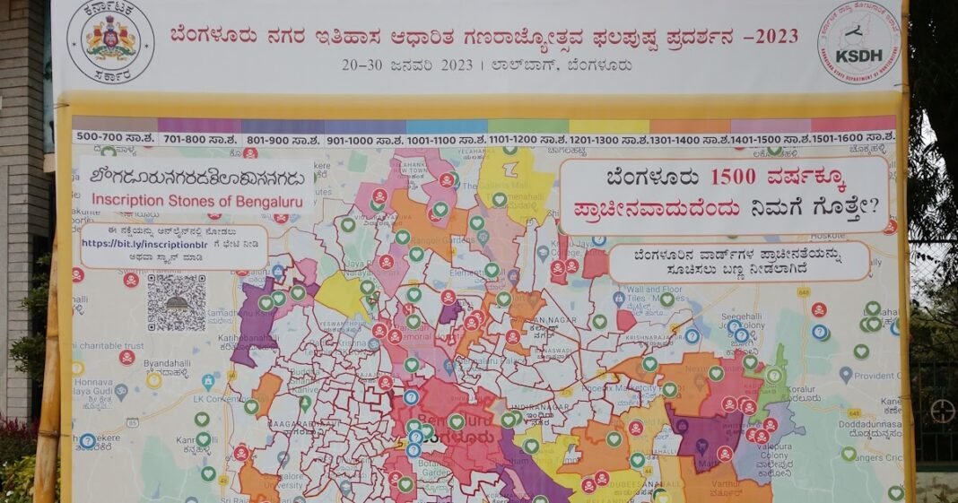 A nice little discovery was made while looking cycling photographs in my archive on Jan 5th. The photo was shot at the history-based Republic Day flower show at Lalbagh held between Jan 20th and Jan 30th 2023. The text on the map caught my attention – it was a map of inscription stone locations in Bengaluru district. The map, published by The Mythic Society, is a part of the project titled “Bengaluru Inscriptions 3D Digital Conservation Project.” The printout exhibited at the flower show was to evoke curiosity about inscriptions. Those interested had to go online and open the weblink shown on the exhibit which in turn lead to the map The Incredible Inscription Stones of Bengaluru on Google Maps. The locations of inscription stones are marked on the map, one could click a particular pin to see the details of that inscription. The map has hundreds of locations classified into three sections- 1. inscription present at the site, 2. inscription is missing from the site, and 3. inscriptions whereabout is unknown. The map also has marked areas based on time period. One has to appreciate the efforts of the team behind this endeavor. This is a significant contribution towards documenting our heritage.