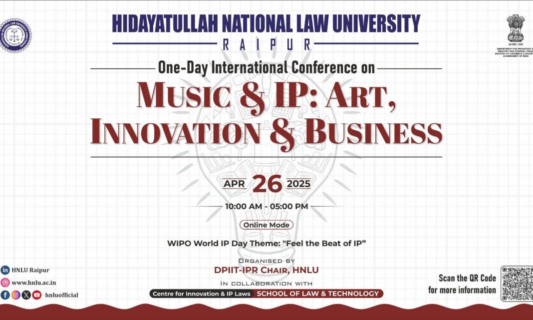 Centre for Innovation and IP Laws (CIIPL) at Hidayatullah National Law University, Raipur, is delighted to announce the Virtual International Conference on “Music and IP: Art, Innovation & Business” to celebrate World Intellectual Property Day on 26th April 2025.