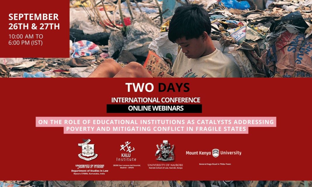 Department of Studies in Law, University of Mysore (India) is organising a Two-Day International Conference on The Role of Educational Institutions as Catalysts in Addressing Poverty and Mitigating Conflict in Fragile States, in collaboration with Kalu Institute (Madrid, Spain), School of Law, University of Nairobi (Kenya), and Mount Kenya University (Kenya).