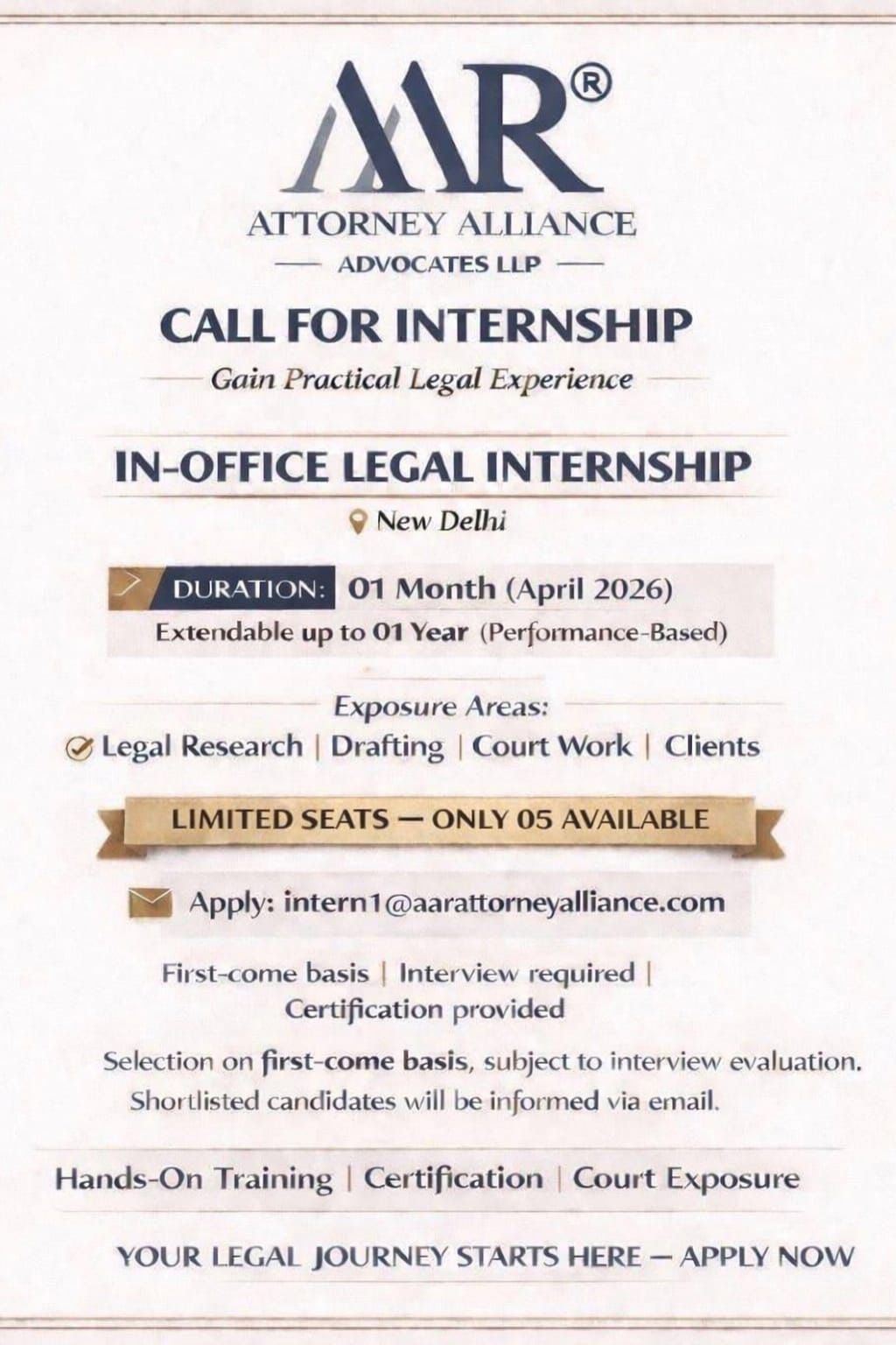 AAR Attorney Alliance Advocates LLP is inviting applications for its Virtual Legal Internship Programme. This internship is designed to provide practical exposure through live projects, legal research, and mentorship from experienced professionals.