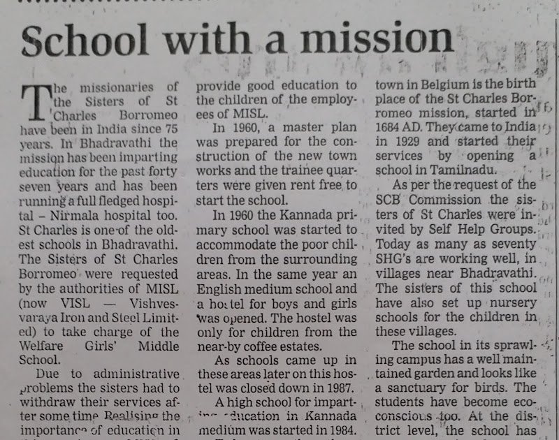 The missionaries of the Sisters of St Charles Borromeo have been in India since 75 years. In Bhadravathi the mission has been imparting education for the past forty seven years and has been running a full fledged hospital Nirmala hospital too. St Charles is one of the oldest schools in Bhadravathi. The Sisters of St Charles Borromeo were requested by the authorities of MISL (now VISL – Vishvesvaraya Iron and Steel Limited) to take charge of the Welfare Girls’ Middle School.