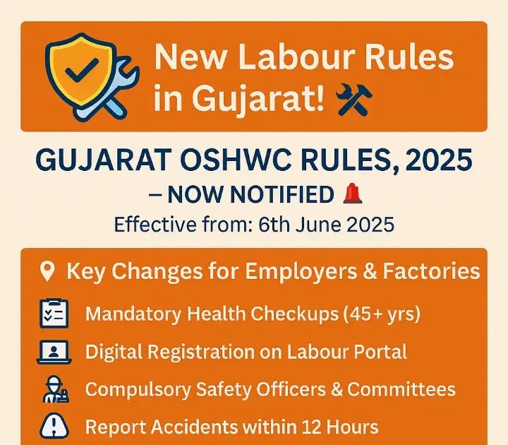 On 6th June 2025, the Government of Gujarat notified the much-anticipated Gujarat Occupational Safety, Health and Working Conditions Rules, 2025 under the OSHWC Code, 2020. These rules consolidate several previous labour regulations, aiming to streamline and strengthen workplace safety, health, and welfare standards across factories and establishments in Gujarat.