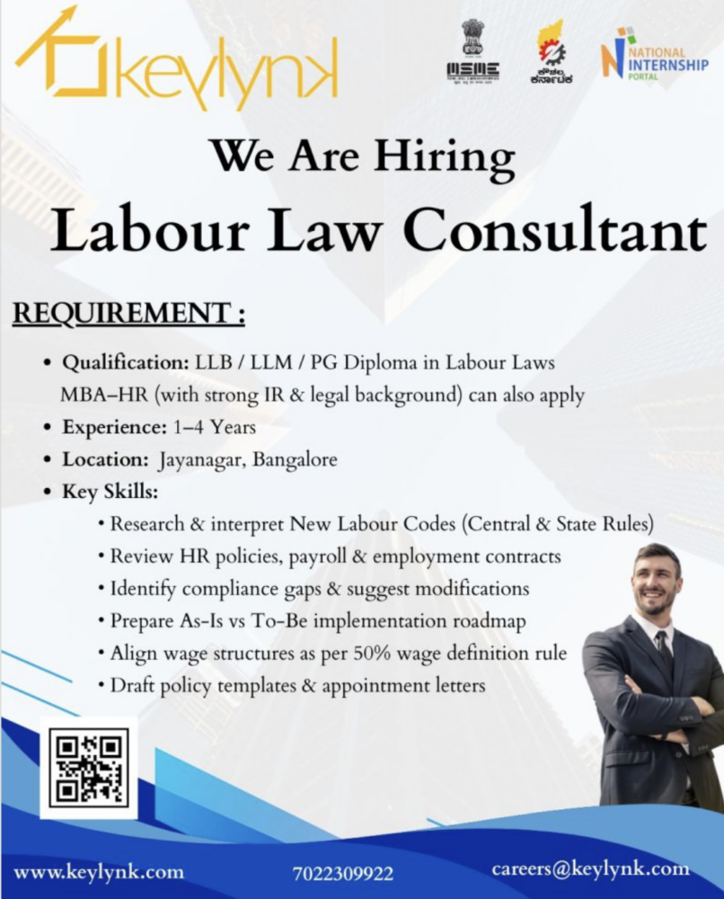 - Qualification: LLB / LLM / PG Diploma in Labour Laws.