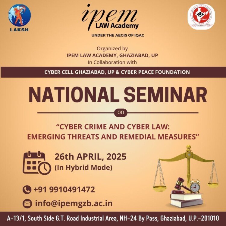 IPEM Law Academy Ghaziabad is organizing a National Law Seminar on “CyberCrime and Cyber Law: Emerging Threats and Remedial Measures” (Under the aegis ofthe Internal Quality Assurance Cell-IQAC) on 26th April, 2025 (Saturday).