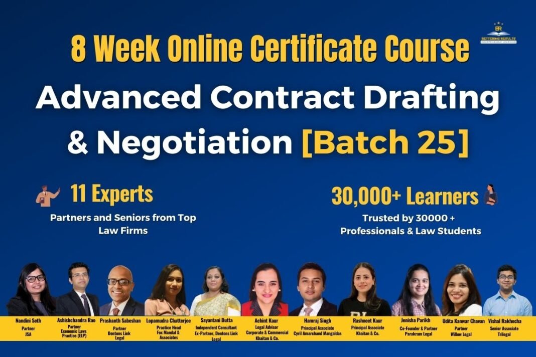 This 8-week Certificate Course will help you draft all types of agreements, including Employment Agreements, IT-specific agreements, Shareholders’ Agreements, Loan Agreements, IP Assignment Agreements, etc. It is a great course for those looking to get started with contracts and the law in general or excel in it.