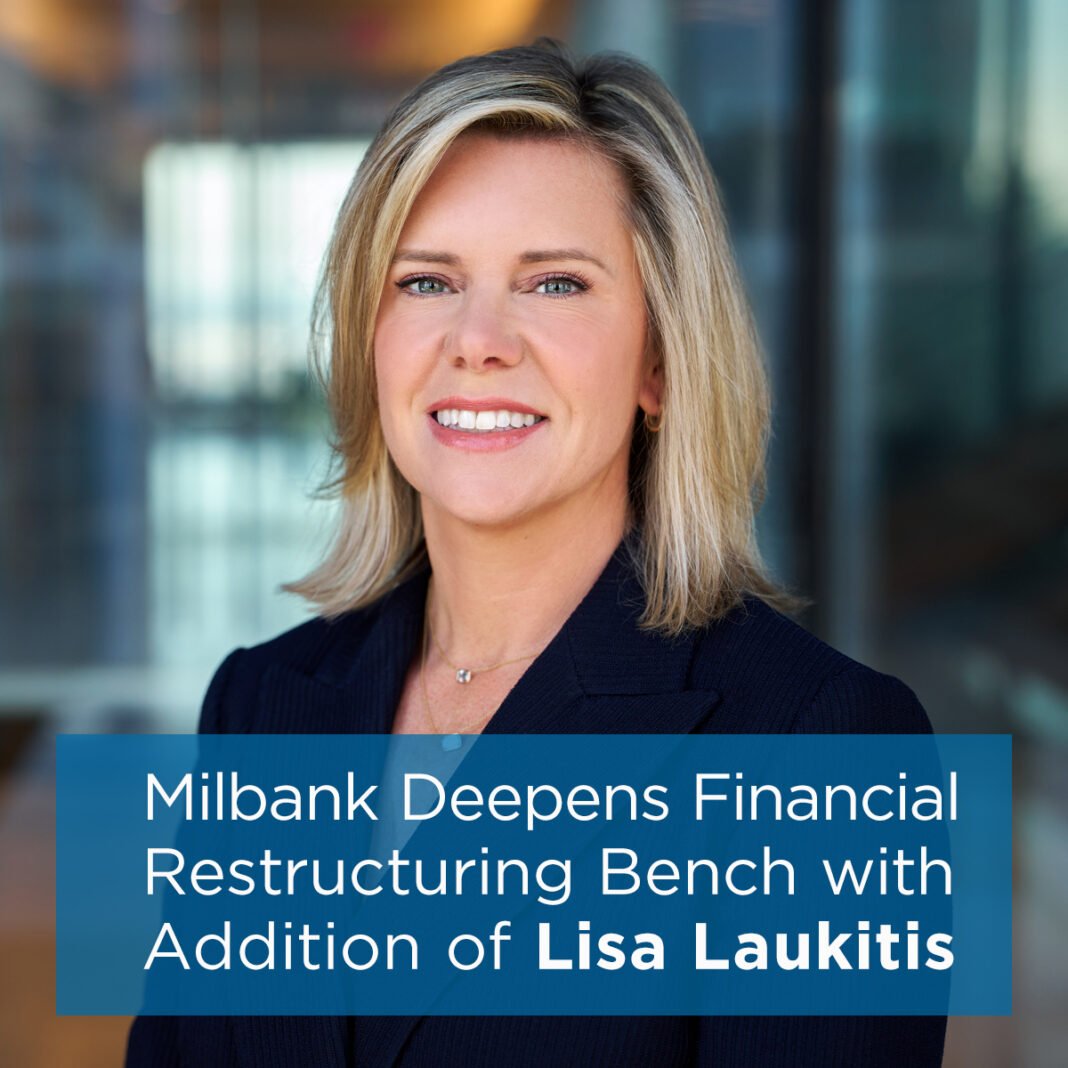Commenting on Ms. Laukitis’ arrival, Dennis Dunne, Global Chair of Milbank’s Financial Restructuring Group and member of the Executive Committee, said: “Lisa is one of the leading lights in our business. She has incomparable experience representing companies on their most difficult and complex matters. She has a loyal following among manifold clients because her keen legal acumen is matched with a deeply commercial approach that animates her advice. Companies and creditors have long leaned on Lisa as a trusted advisor to guide them through their most turbulent and consequential situations. We are honored that she has decided to join our industry-leading team of restructuring lawyers. We look forward to working with Lisa as we continue to grow the depth and breadth of our practice.”