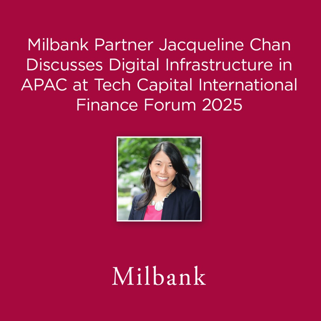 Jacqueline Chan, a partner in Milbank LLP’s Singapore office, recently moderated a high-profile panel discussion titled “Assessing the Cost: Financing the Future of APAC’s Digital Infrastructure” at the Tech Capital International Finance Forum and Global Awards 2025, held on May 13 in London. She also served as a judge for The Tech Capital Global Awards, which recognized outstanding achievements across the global digital landscape, encompassing finance, development and regulatory frameworks.