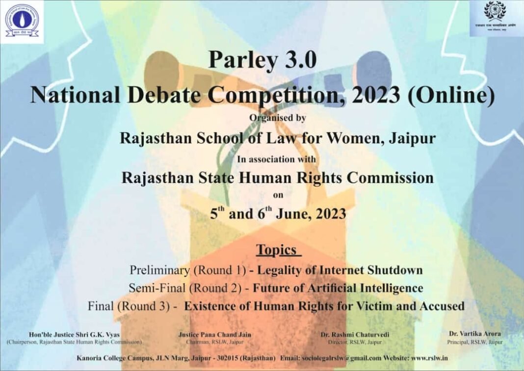 Rajasthan School of Law for Women in association with Rajasthan State Human Rights Commission is organising PARLEY 3.0 NATIONAL DEBATE COMPETITION (ONLINE).