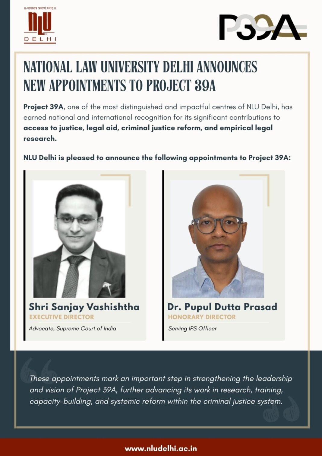 National Law University Delhi is pleased to announce the appointment of Shri Sanjay Vashishtha, Advocate, Supreme Court of India, as Executive Director and Dr. Pupul Dutta Prasad, serving IPS Officer, as Honorary Director of Project 39A.