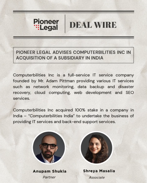 Pioneer Legal assisted and advised Computerbilities Inc in acquisition of subsidiary in India
