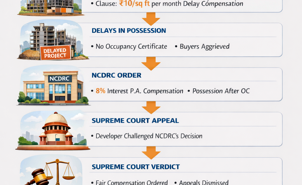 The dispute arose from prolonged delays in handing over possession of flats in the “Parsvnath Exotica” project at Gurugram. The developer had included a clause (Clause 10(c)) in the Apartment Buyer Agreement providing compensation for delay at ₹10 per square foot per month.