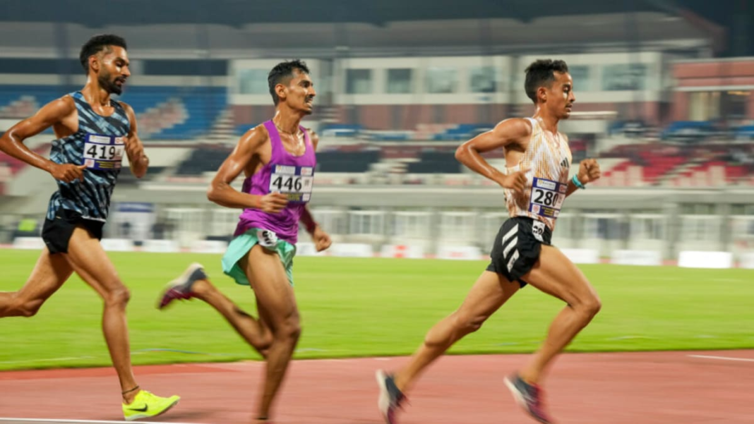 Sawan Barwal (R) of Himachal Pradesh leads as he competes in the men’s 5000m run at the 27th National Federation Senior Athletics Competition, in Bhubaneswar, Monday, May 13, 2024. Barwal won the event. (PTI Photo/Gurinder Osan)
