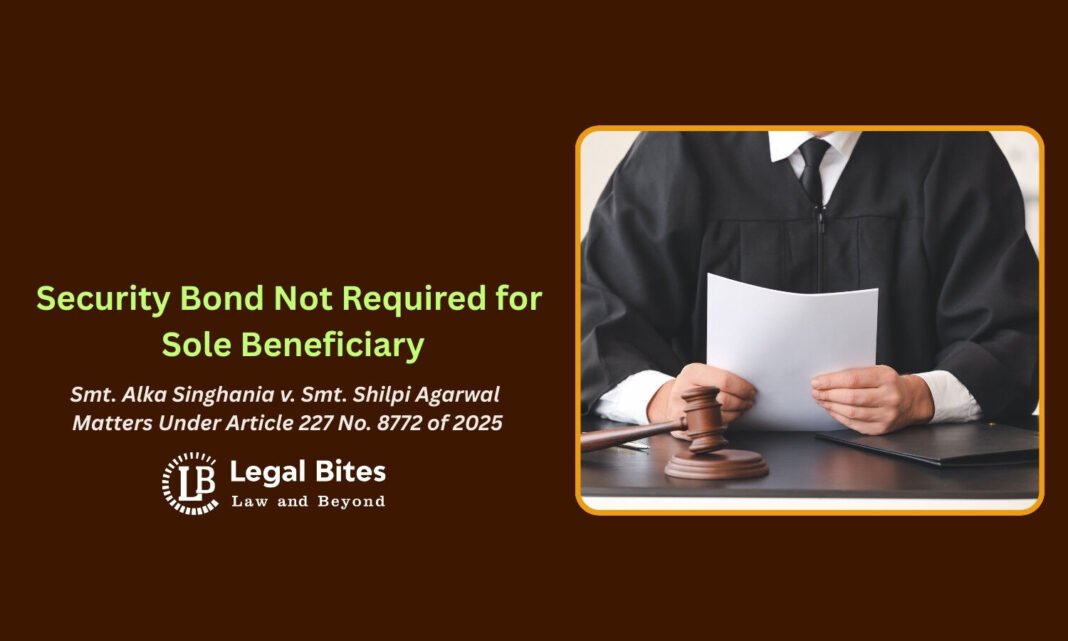 The Allahabad High Court recently clarified an important aspect of succession law concerning the grant of succession certificates. In Smt. Alka Singhania v. Smt. Shilpi Agarwal (Matters Under Article 227 No. 8772 of 2025), the Court held that when a petitioner is the sole beneficiary of the deceased’s estate, and there are no objections from any other legal heir or claimant, the court should not mechanically insist on the furnishing of a security bond.