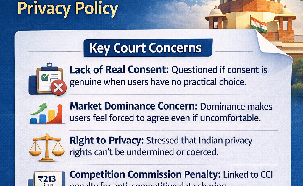 The Supreme Court’s remarks highlight that digital platforms operating in India must ensure clear communication, genuine consent, and respect for user privacy. The case signals stricter judicial scrutiny of large technology companies, especially where personal data and competition issues overlap.