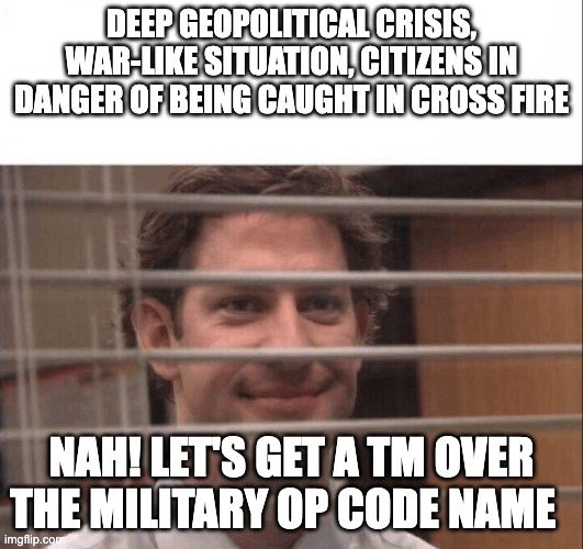 A meme featuring a character smiling through blinds, with text highlighting the absurdity of trademarking a military operation name during a geopolitical crisis.